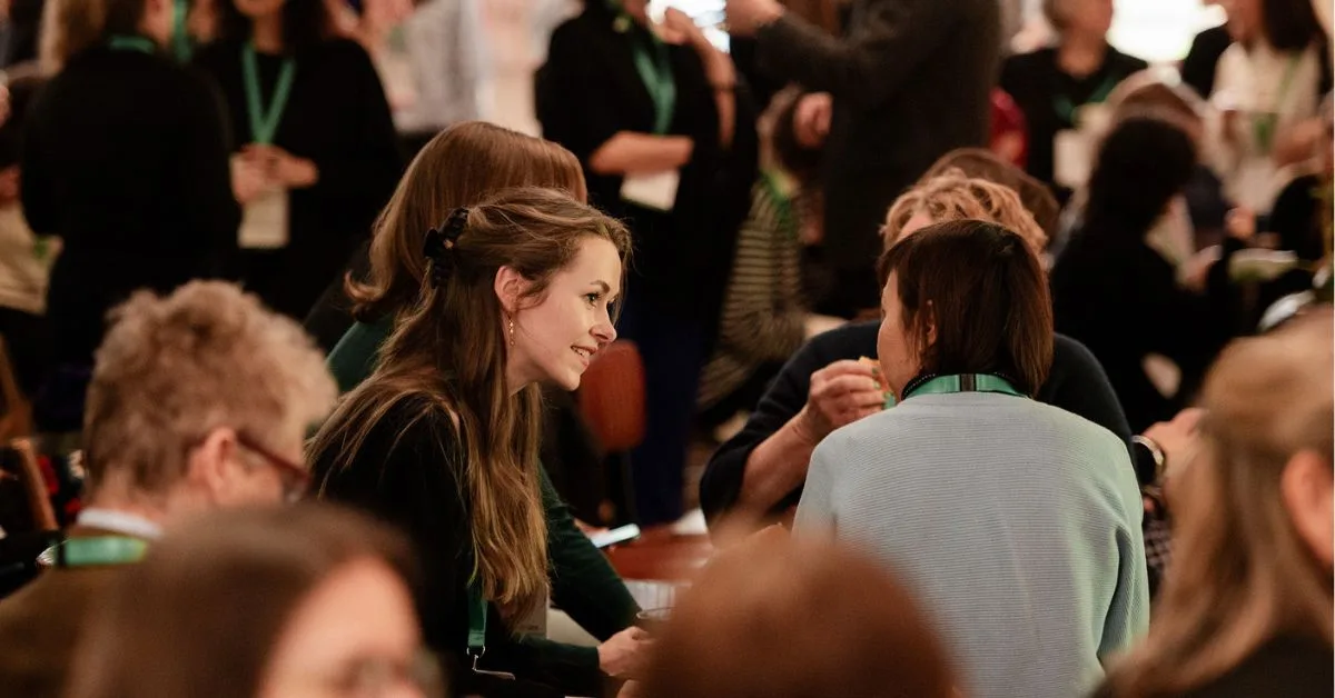 A crowd of people sitting at tables at the Conduit Solutions Lab Refugee Summit in London