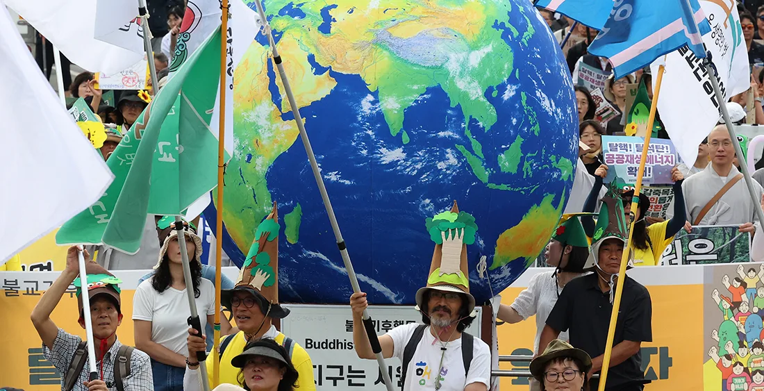Photo credits: Main image of a Climate protest in South Korea, Getty Images/Chung Sung-Jun; Profile photo of Professor Bomberg and Professor Bomberg next to the Multilevel Action Pavilion banner, courtesy of Professor Elizabeth Bomberg.